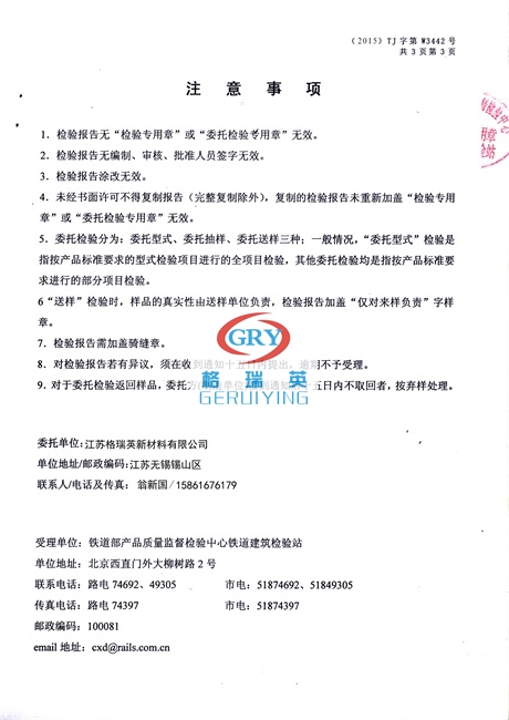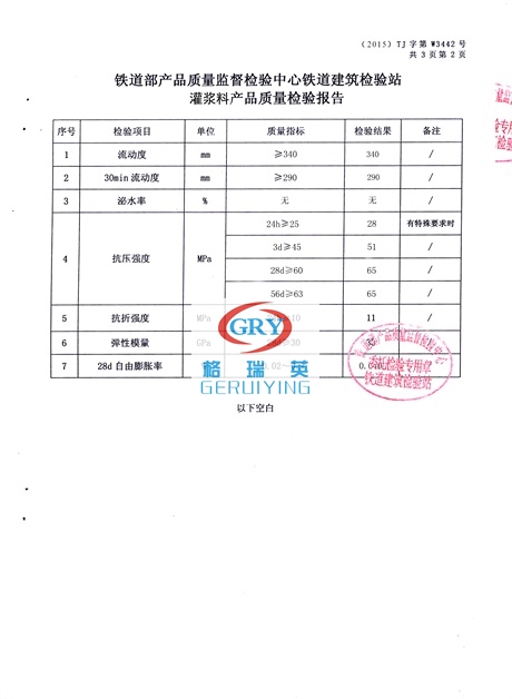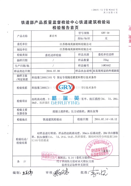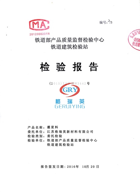 鐵道部檢驗——《江蘇格瑞英灌漿料檢驗報告