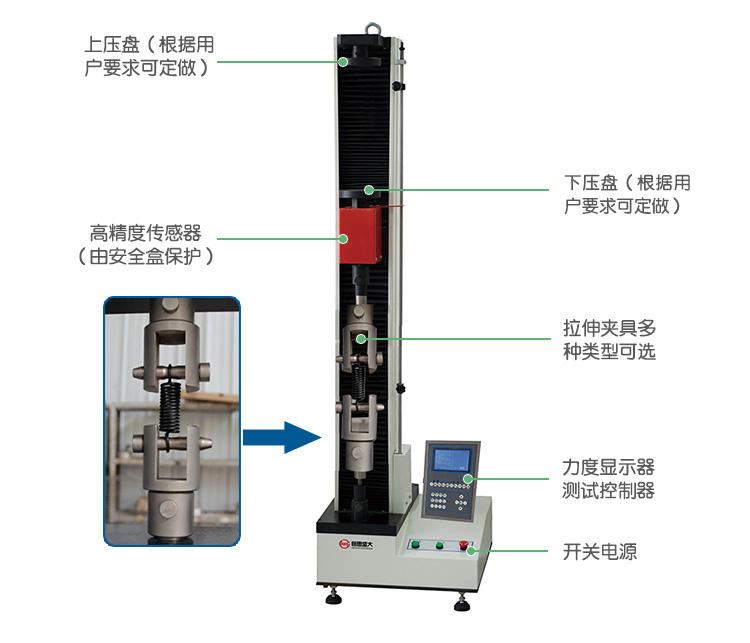 本機(jī)依據(jù)國(guó)家彈簧拉壓試驗(yàn)機(jī)標(biāo)準(zhǔn)規(guī)定的技術(shù)要求制成,專(zhuān)業(yè)設(shè)計(jì)的自動(dòng)控制和數(shù)據(jù)采集系統(tǒng),實(shí)現(xiàn)了數(shù)據(jù)采集和控制過(guò)程的全數(shù)字化調(diào)整。能對(duì)拉簧、壓簧、碟簧、塔簧、板簧、卡簧、、片彈簧、復(fù)合彈簧、氣彈簧、模具彈簧、、異形彈簧等精密彈簧的拉力、壓力、位移、剛度等強(qiáng)度試驗(yàn)和分析。