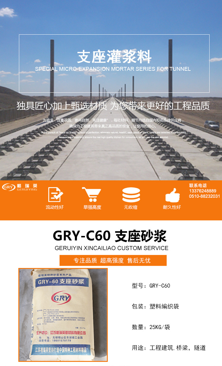 產品簡介:C60支座砂漿 主要性能指標 項目 GRY-C40 GRY-C50 GRY-C60 GRY-C70 GRY-C80 GRY-C90 抗壓強度(MPa) 2h / / / 20 / / 1d 20 25 30 40 / 55 28d 40 65 65 65 80 65 56d 60 65 65 65 80 90 90d 不降低 不降低 不降低 不降低 不降